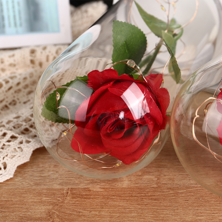 Світлодіодна гірлянда всередині колби підкреслює форму квітки і м'яко підсвічує простір, завдяки чому троянду можна використовувати як нічник або декоративне освітлення.