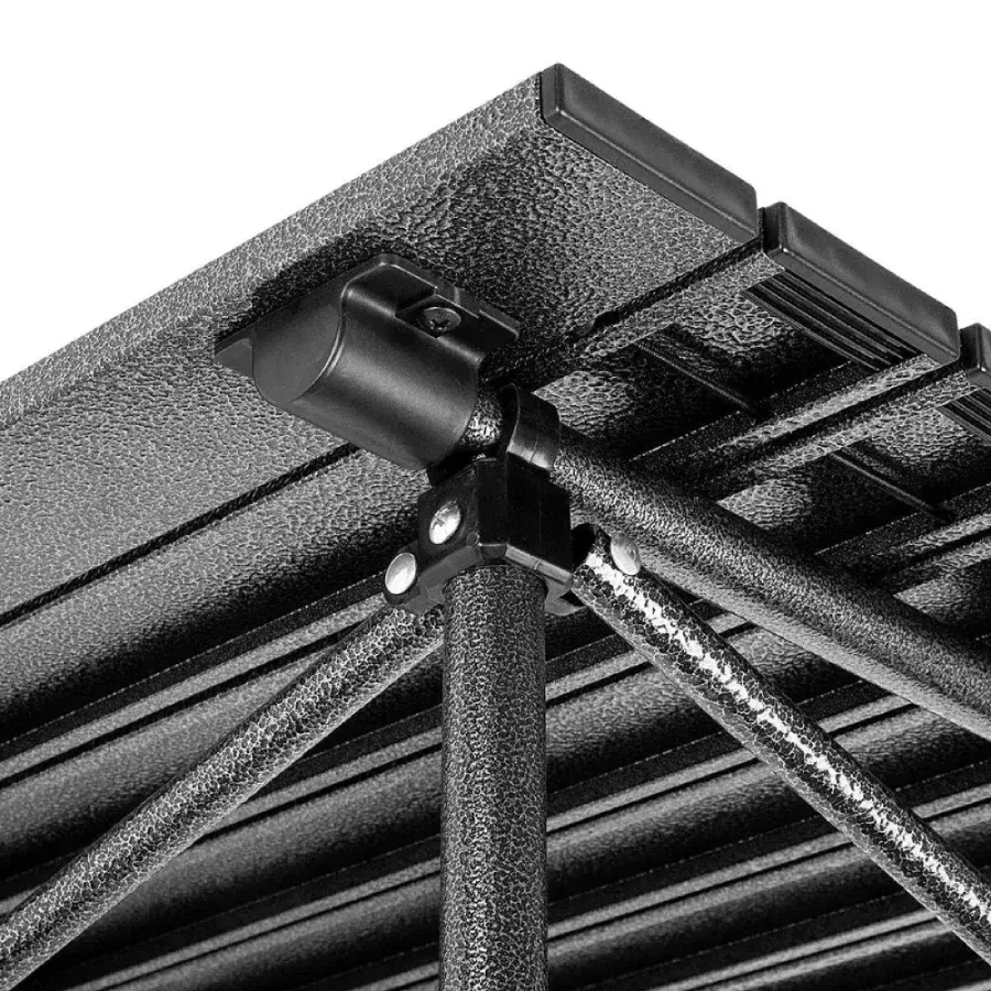 Стільниця виконана з алюмінію, стійкого до вологи та перепадів температур. Каркас виготовлений з сталі, а шість опор з перемичками забезпечують хорошу стійкість навіть на нерівній поверхні.