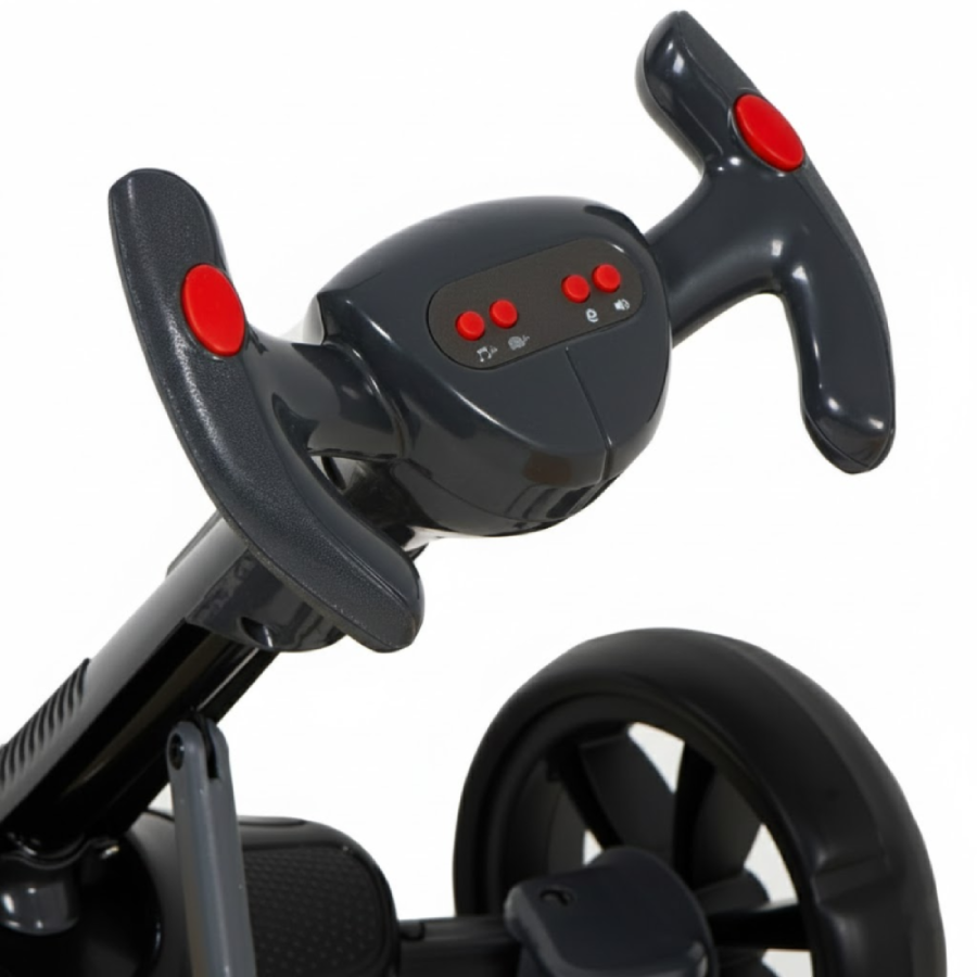 Широкі колеса з EVA-матеріалу забезпечують плавний хід і добре зчеплення з поверхнею. Стійка база і низький центр ваги роблять електрокарт стабільним і зручним для дитини.