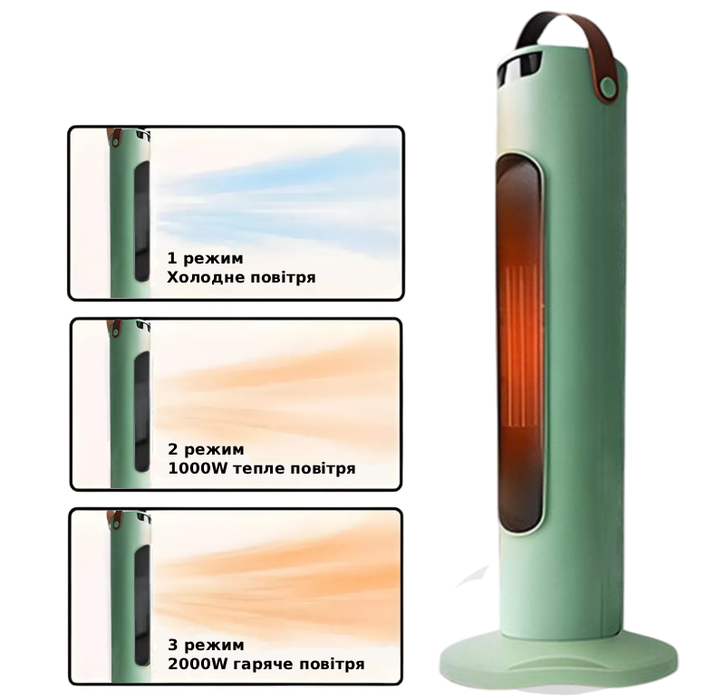 - Режими: Вентиляція / Обігрів 1000 Вт / Обігрів 2000 Вт